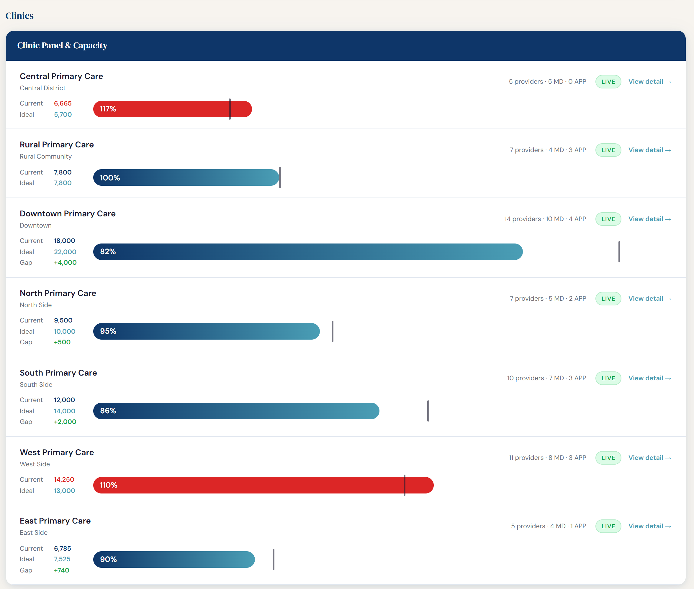 Receive reports showing capacity, demand, and opportunities at the provider, clinic, and group level.
